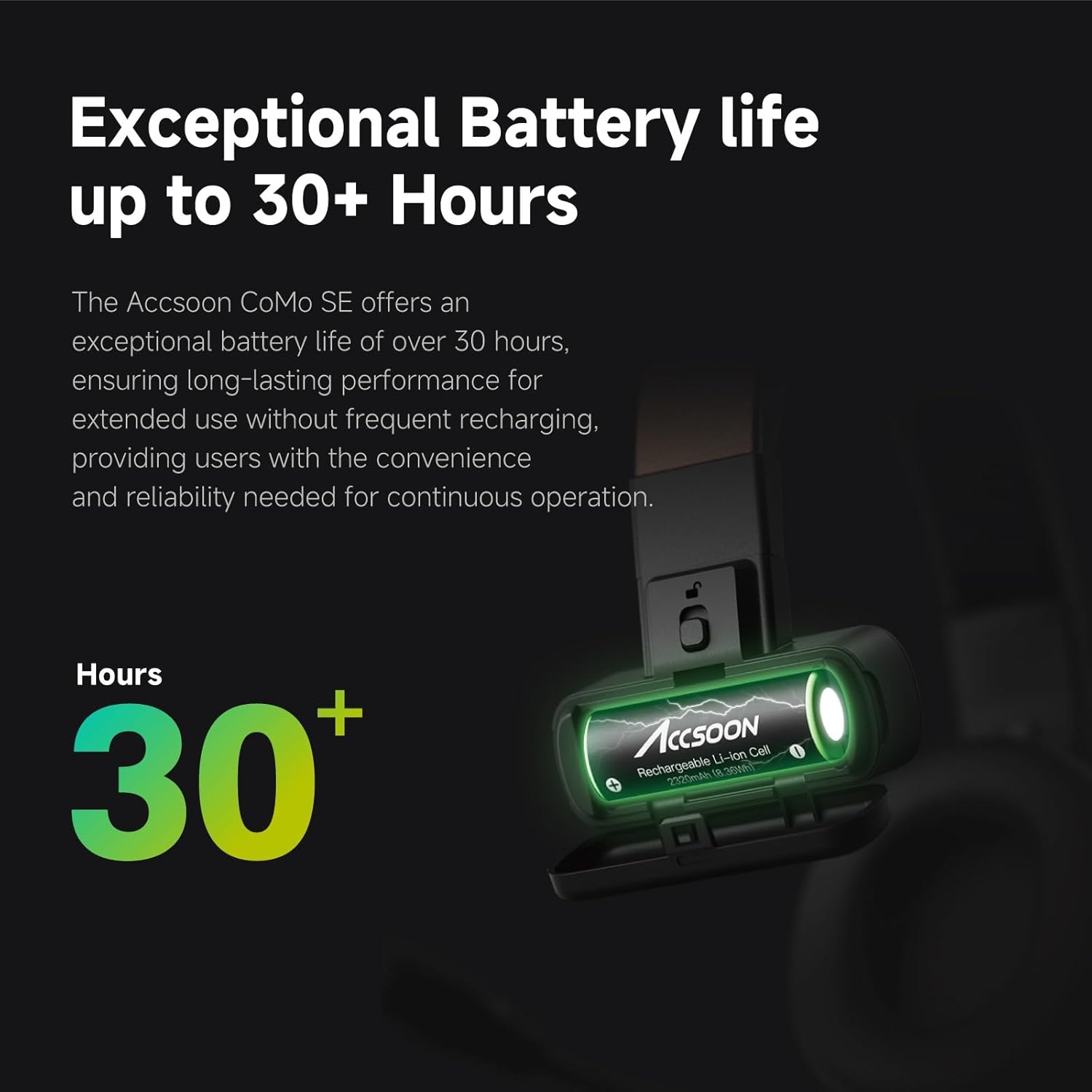 - The Accsoon CoMo SE offers an exceptional battery life of over 30 hours, ensuring long-lasting performance for extended use without frequent recharging