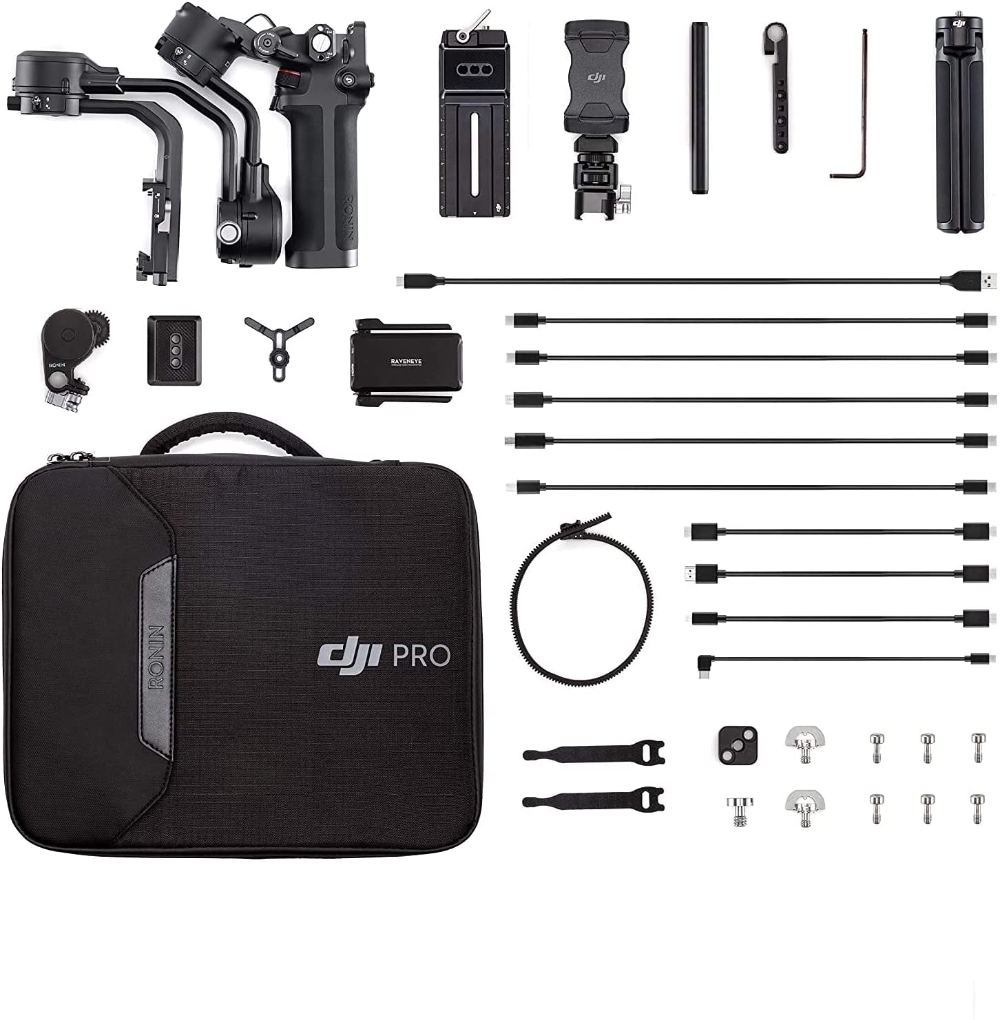 RSC 2 gimbal with the RavenEye 1080p transmitter, a focus motor, phone holder, two focus gears, and three HDMI cables.