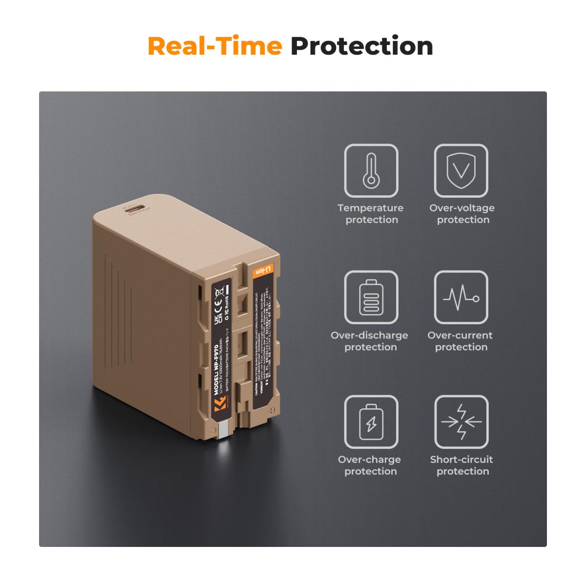 - 7.3V 10500mAh 76.65Wh Powerful Capacity NP-F970 built-in high-quality Li-ion battery with long battery life, longer battery life than the original, suitable for long time video production and photography projects, no memory effect.