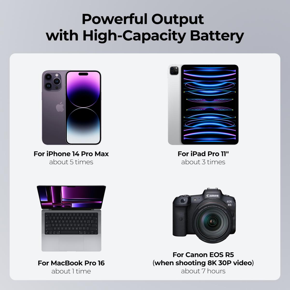 • * Multiple Interfaces. This V-Mount battery with USB-C, USB-A, BP and D-TAP ports is more versatile and supports powering multiple devices at the same time, such as DSLR cameras, camcorders, monitors, smartphones, wireless video transmitters, tablets and laptops.