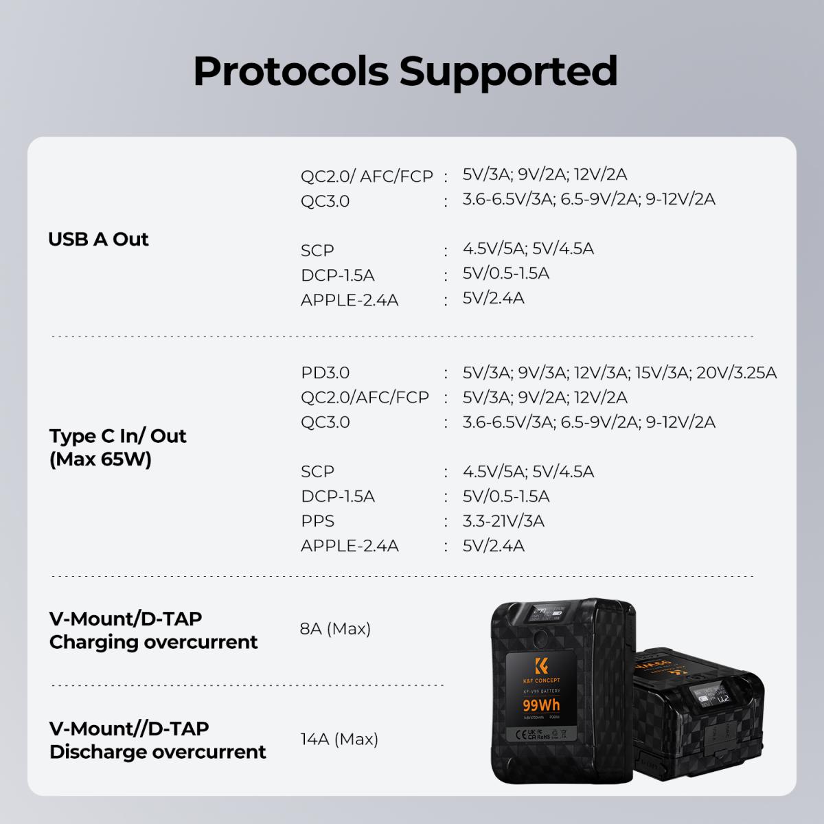 K&F V Mount Battery 99Wh Mini V-Mount Battery 6700mAh 14.8V Support 65W PD USB-C Fast Charger with D-TAP USB-A USB-C BP OLED Screen for Cameras and Camcorders. Key Features: