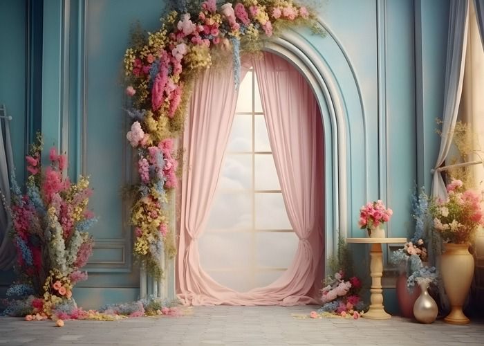 Vibrant Floral Wedding Photography Backdrop in Nairobi with Pink Curtains: Features a light blue wall with an arched doorway, material is vinyl….
